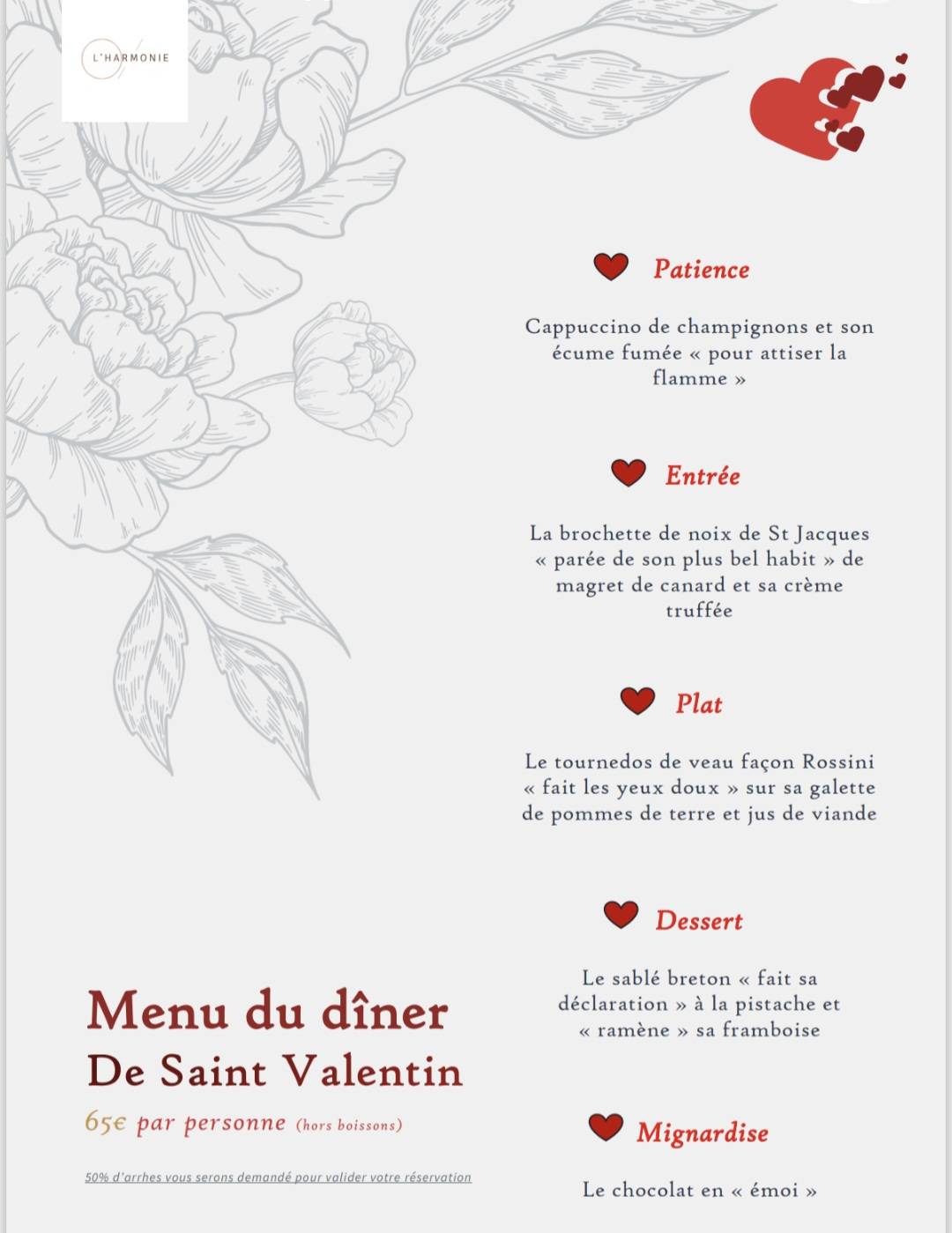À l’occasion de la Saint-Valentin, le restaurant L’Harmonie vous invite à découvrir un menu spécialement élaboré pour cette soirée.